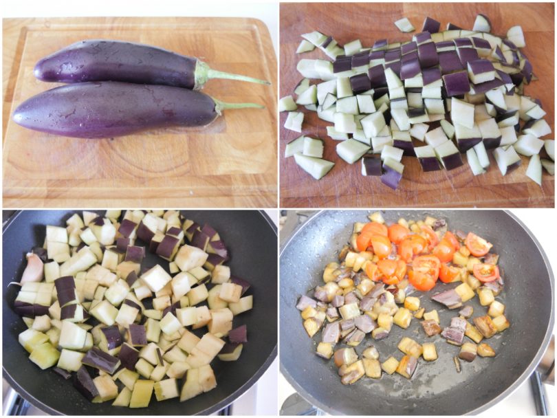 Innanzitutto lavate e asciugate le melanzane, spuntatele e tagliatele a cubetti.