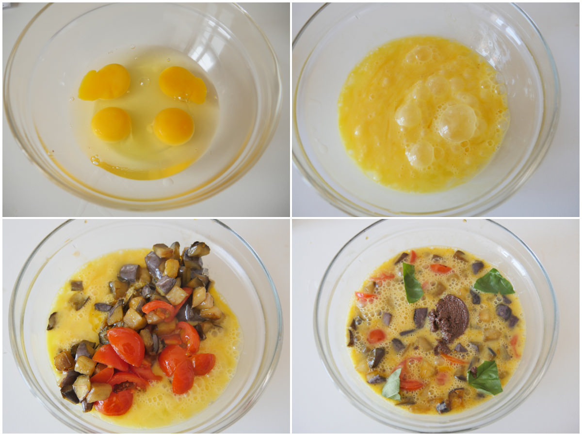 Nel frattempo sbattete le uova con un po' di sale, quindi incorporate anche le melanzane, il trito di olive e il basilico fresco spezzettato.