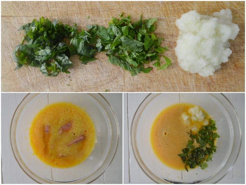 Tritate prezzemolo e cipolla e uniteli alle uova, insieme al tonno ben sgocciolato e alla buccia di limone grattugiata.