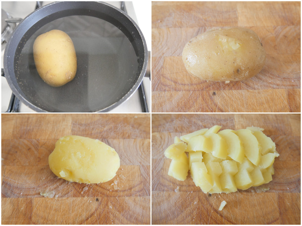 Innanzitutto bollite la patata per circa 30 minuti (in modo che sia quasi completamente cotta), quindi pelatela e tagliatela a pezzetti.