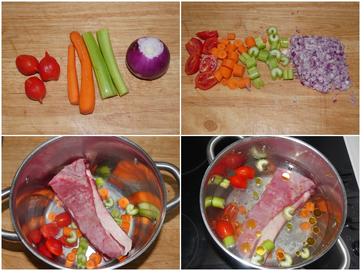 Innanzitutto preparate il brodo: lavate e mondate le verdure, tagliatele a cubetti (io la cipolla l'ho tritata finemente e aggiunta in un secondo momento) e mettetele in una pentola con acqua, carne e un filo d'olio.
