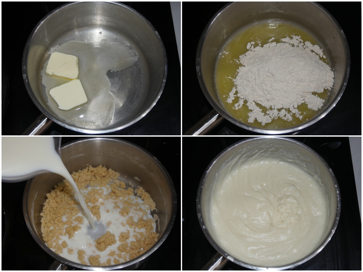 Innanzitutto preparate la besciamella: fate sciogliere il burro in una casseruola, amalgamateci dentro la farina, incorporate anche il latte, il sale e la noce moscata e cuocete a fiamma dolce, mescolando continuamente, fino ad ottenere una salsa abbastanza densa.