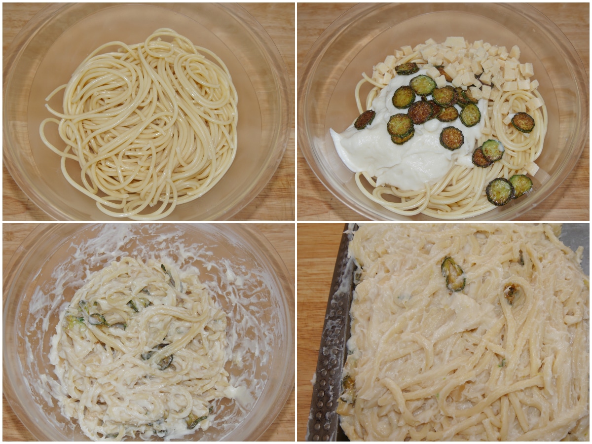 Mischiate i bucatini con besciamella, zucchine e il provolone tagliato a dadini e versate tutto in una teglia da circa 20x20 cm, quindi lasciate compattare in frigorifero per almeno 2-3 ore.