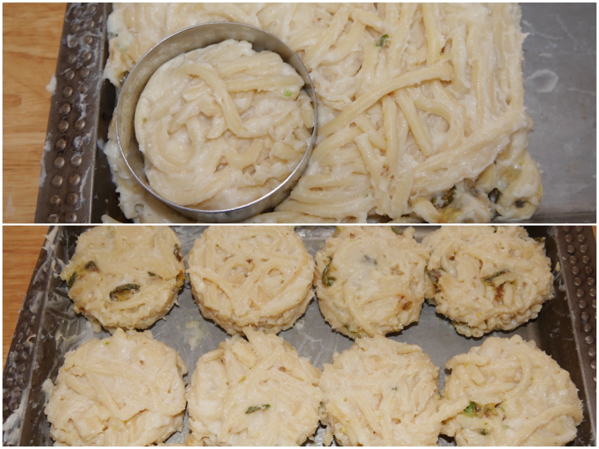 A questo punto riprendete la pasta e, con un coppapasta da 8 cm, ricavate le vostre frittatine tonde (compattate la pasta avanzata e usatela per formare altre frittatine).