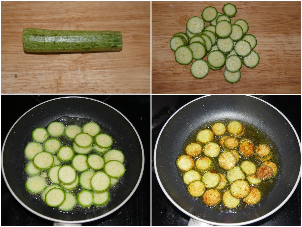 Intanto prendete le zucchine (i 500 gr), lavatele, mondatele, tagliatele a fettine sottili e friggetele in olio caldo, quindi scolatele su carta assorbente.
