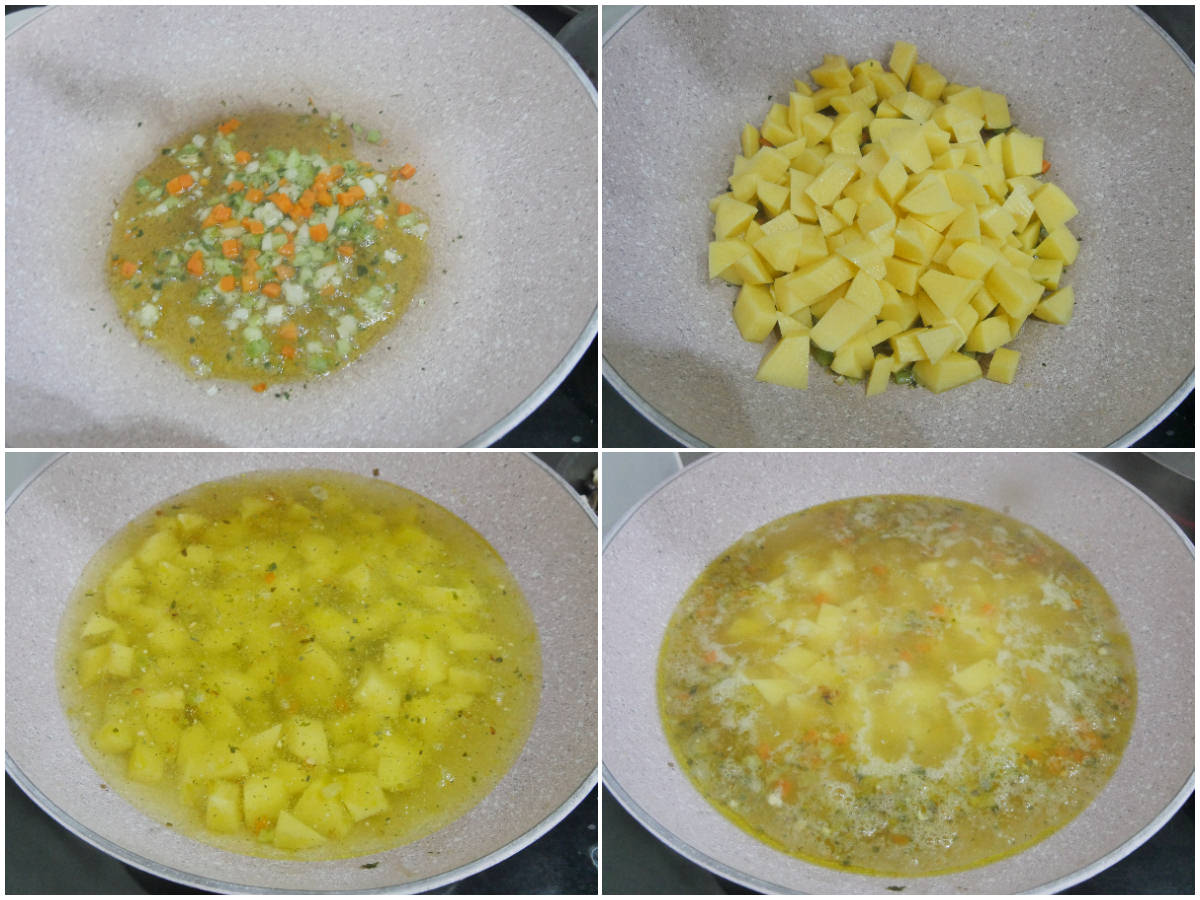 Aggiungete le patate, fatele rosolare per qualche minuto, poi copritele con acqua e fatele sobollire per 20-25 minuti, finché le patate non saranno quasi completamente cotte.