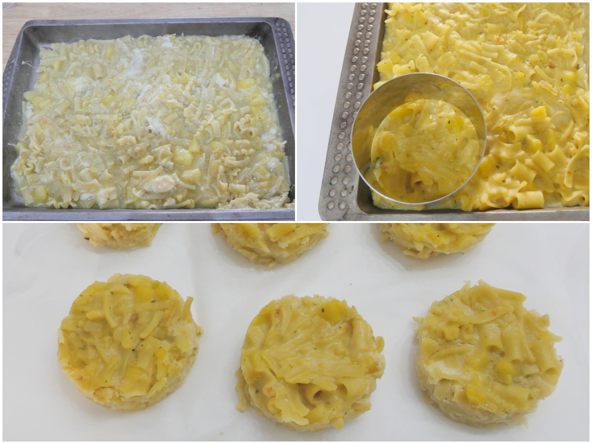 Versate in una teglia non troppo grande (deve venire uno strato di pasta alto circa 3 cm), livellate la superficie e lasciate raffreddare completamente, quindi, con un coppapasta 8 cm, ricavate delle formine (ricompattate la pasta avanzata per creare altre formine, in modo da non sprecarla).