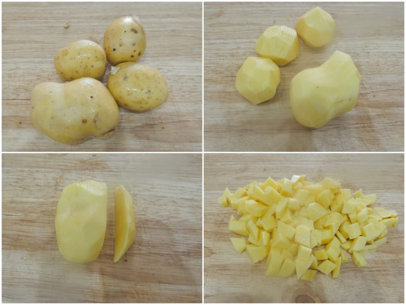 Innanzitutto lavate le patate, pelatele e tagliatele a dadini piuttosto piccoli (in questo modo velocizzerete i tempi di cottura).