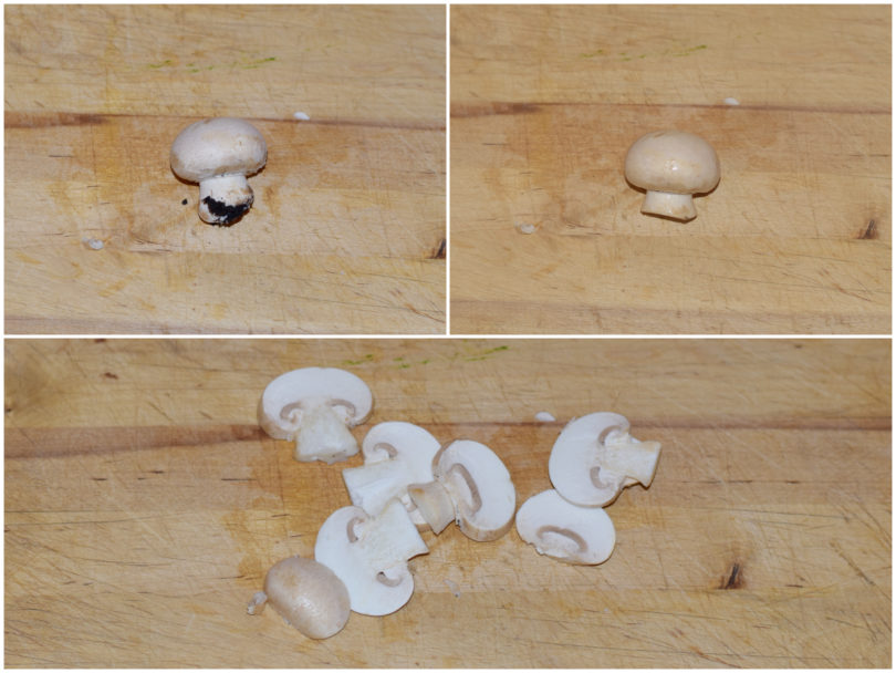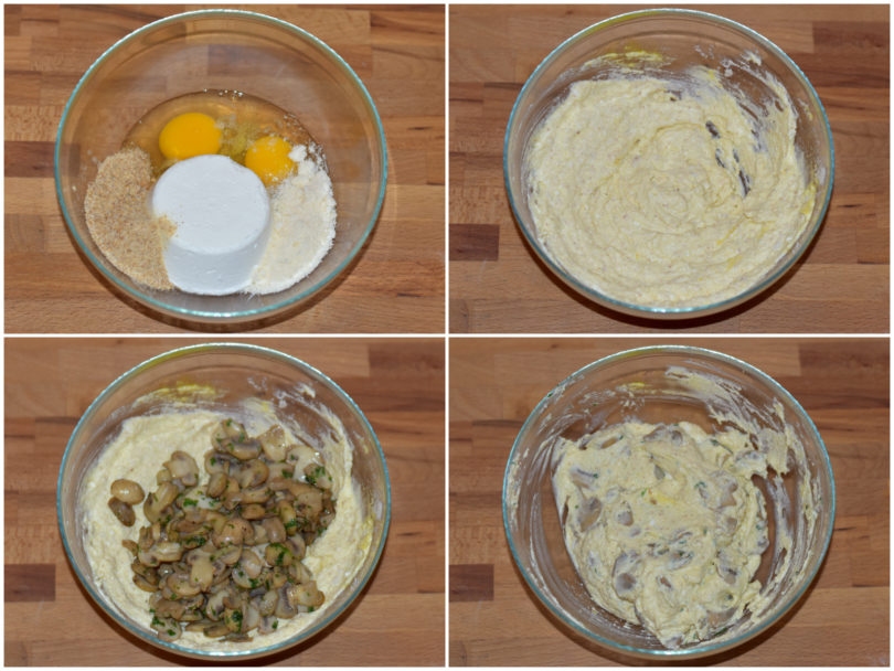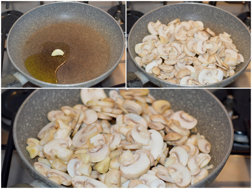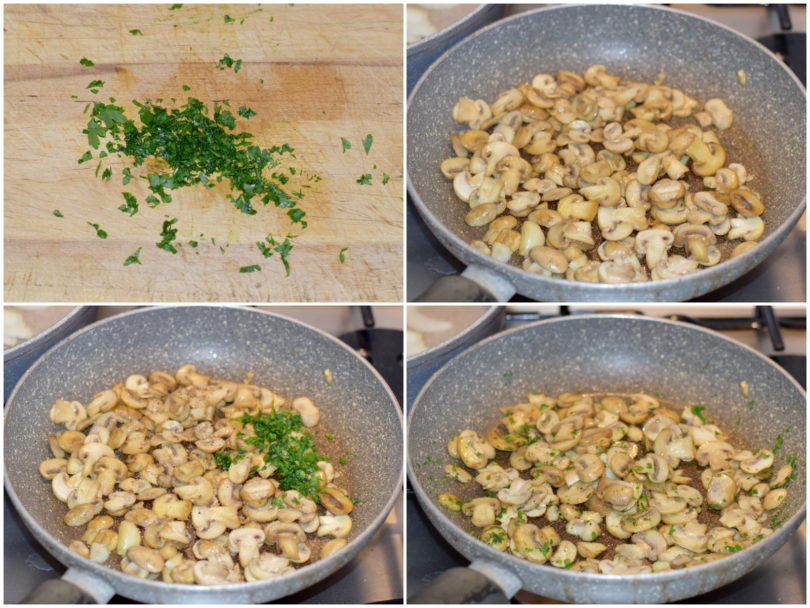 Innanzitutto mondate i funghi (qui la guida per farlo al meglio), tagliateli a fettine e saltateli in padella con sale, olio e aglio per circa 5-10 minuti, aggiungendo il prezzemolo a fine cottura, poi lasciate intiepidire.