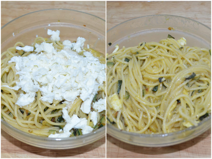 Unite quindi anche spaghetti e zucchine intiepidite e la mozzarella a cubetti.
