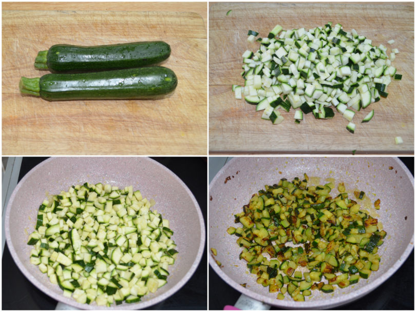 Pulite le zucchine, tagliateli in cubetti piccolini e soffriggetele in padella con il cipollotto, sale, pepe e un po' di olio.