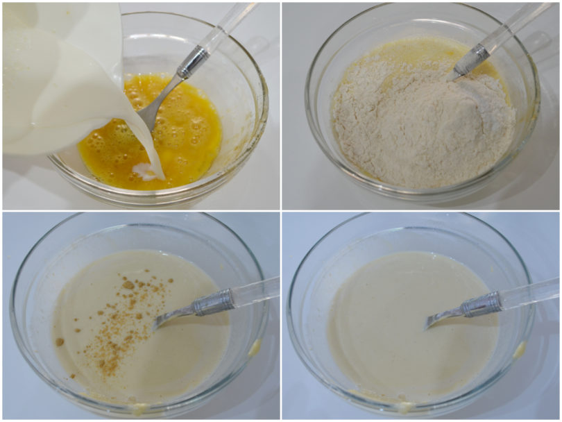Preparate la pastella: sbattete le uova con lo zucchero, quindi incorporate prima il latte e infine farina, lievito e zenzero setacciati.