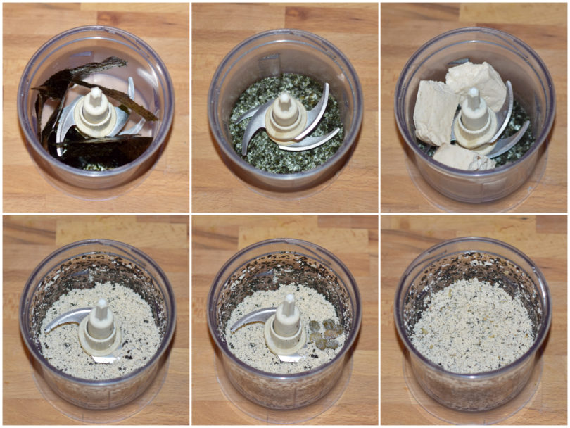 Mettete le alghe spezzettate in un mixer e frullate, poi aggiungete il tofu a pezzi e frullate ancora, quindi unite anche i capperi e frullate un'ultima volta.