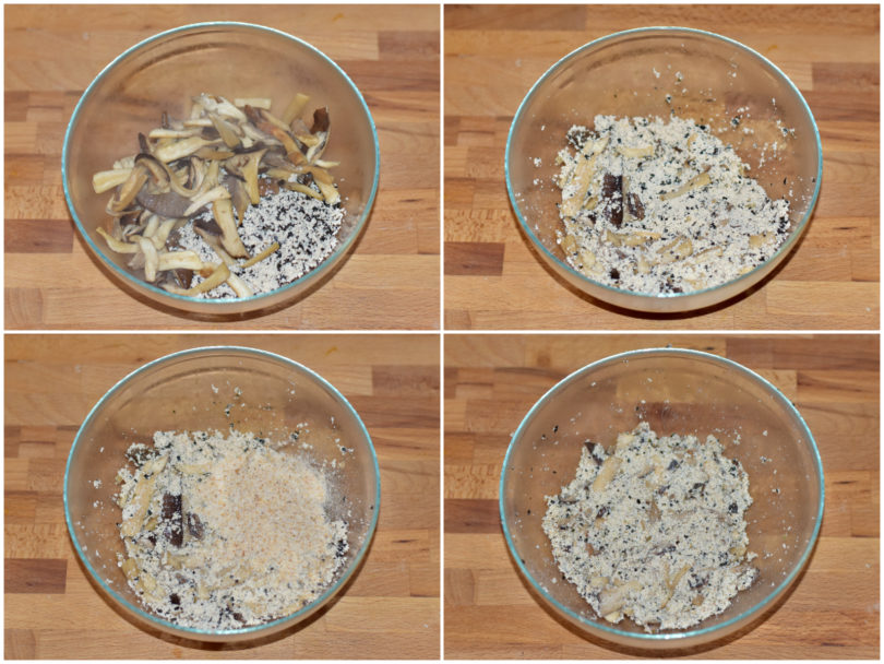 Unite i funghi al composto e mescolate, poi incorporate anche il pangrattato, poco per volta, fino ad ottenere un composto malleabile.