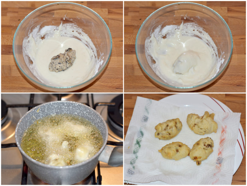 Passate le crocchette nella pastella e friggetele in olio ben caldo, girandole per farle dorare in maniera uniforme e scolandole su carta da cucina man mano che sono pronte.