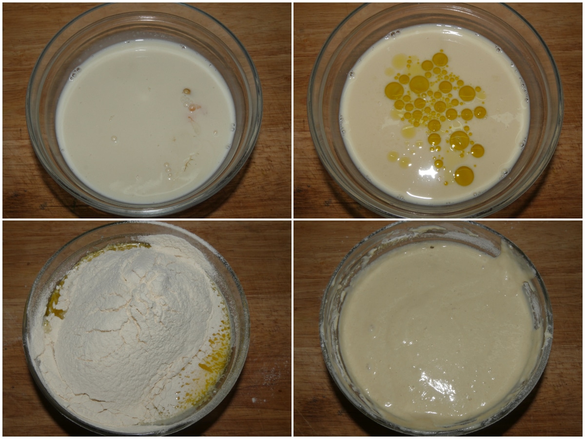 Innanzitutto preparate la pastella, semplicemente mescolando insieme latte e uovo, poi aggiungendo sale e olio e infine incorporano la farina.