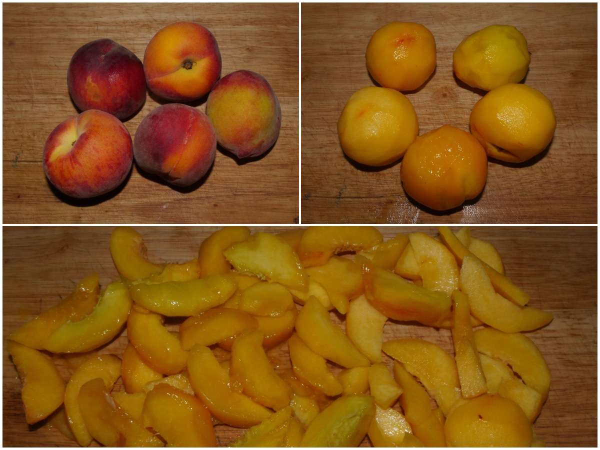 Nel frattempo sbucciate le pesche e tagliatele a fettine.