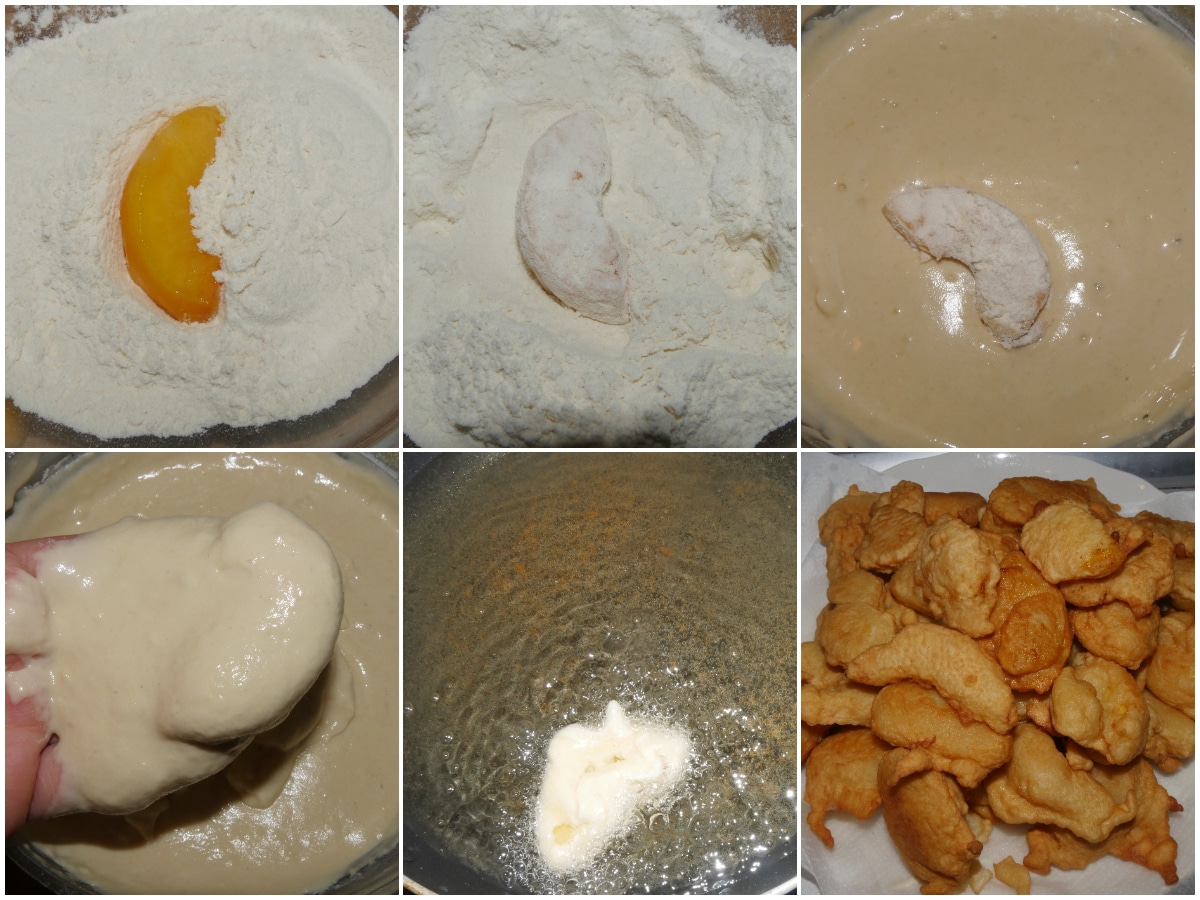 Passate una fettina di pesca per volta nella farina, impanandola in maniera uniforme, e poi nella pastella, quindi friggetele poche per volta in olio già caldo, scola dole man mano su carta da cucina.