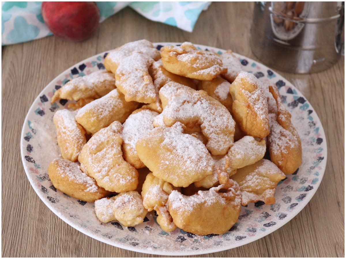 Le frittelle di pesche sono pronte, decorate con tanto zucchero a velo e servitele subito.