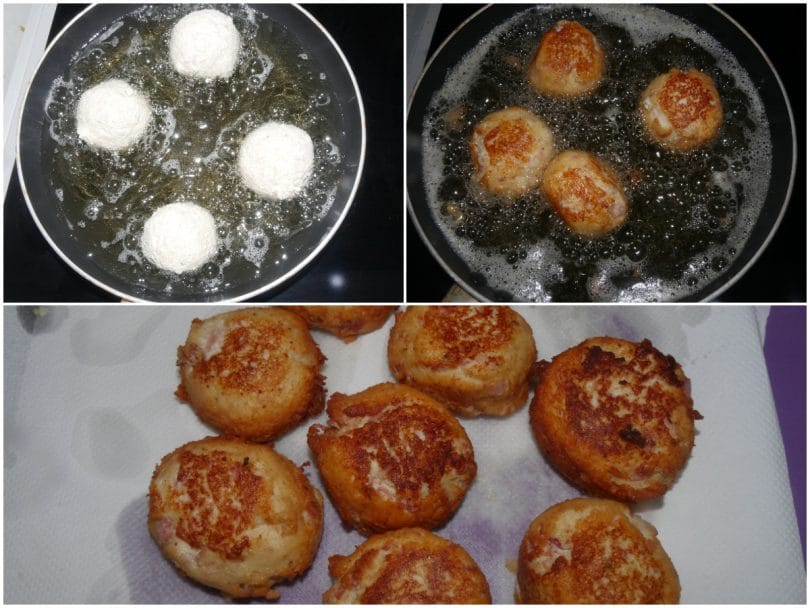 Friggere le frittelle di ricotta e prosciutto un paio di minuti per lato in olio d'arachidi.