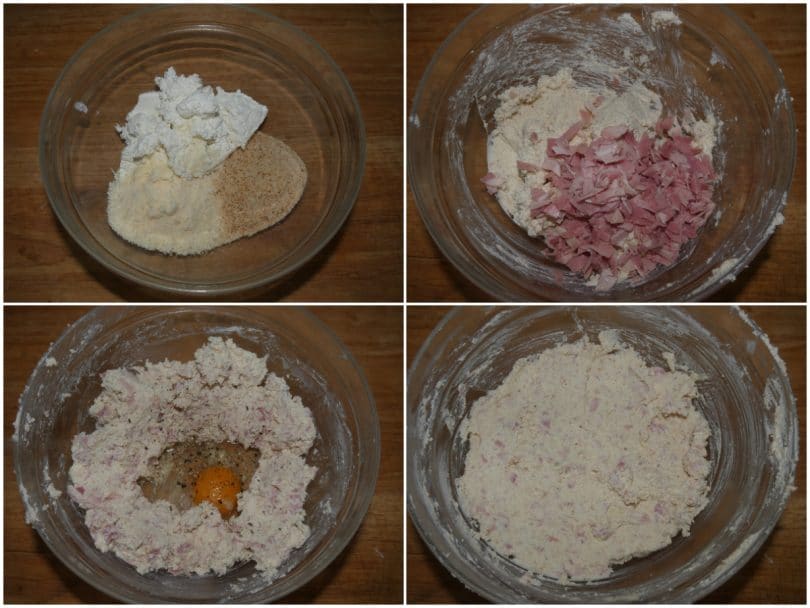 Unire in una terrina la ricotta con la grana, il pangrattato e il prosciutto tagliato a pezzetti
