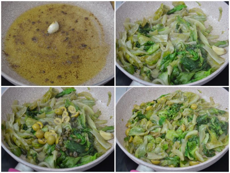Preparate un soffritto di aglio, poco olio e acciughe sminuzzate. Quando le acciughe si saranno sciolte, aggiungete le scarole, i capperi dissalati e le olive denocciolate.