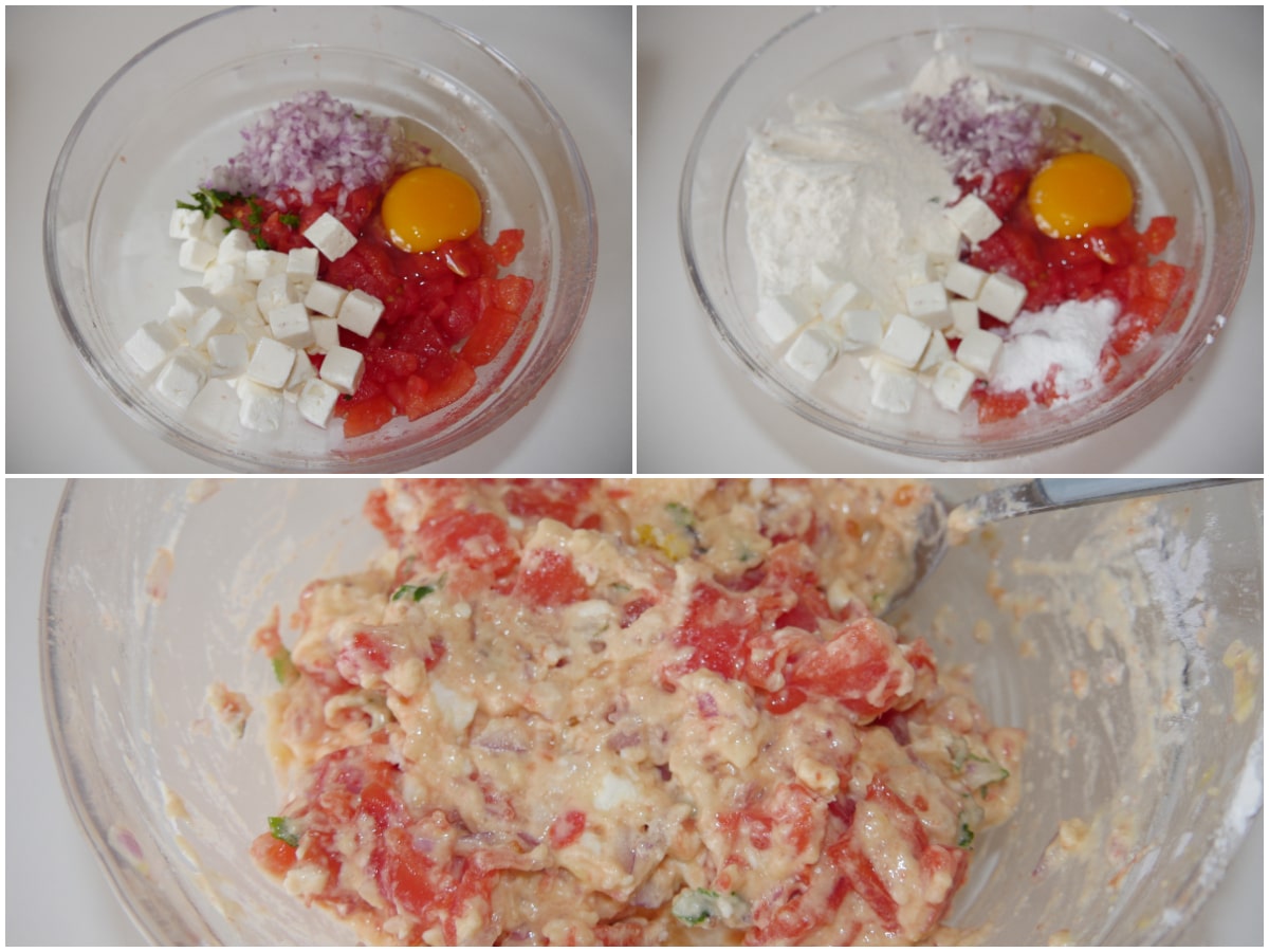 Unite in una ciotola farina, lievito uovo, feta a cubetti, pomodori, cipolla e aromi tritati e mescolate delicatamente fino ad ottenere un composto abbastanza uniforme.