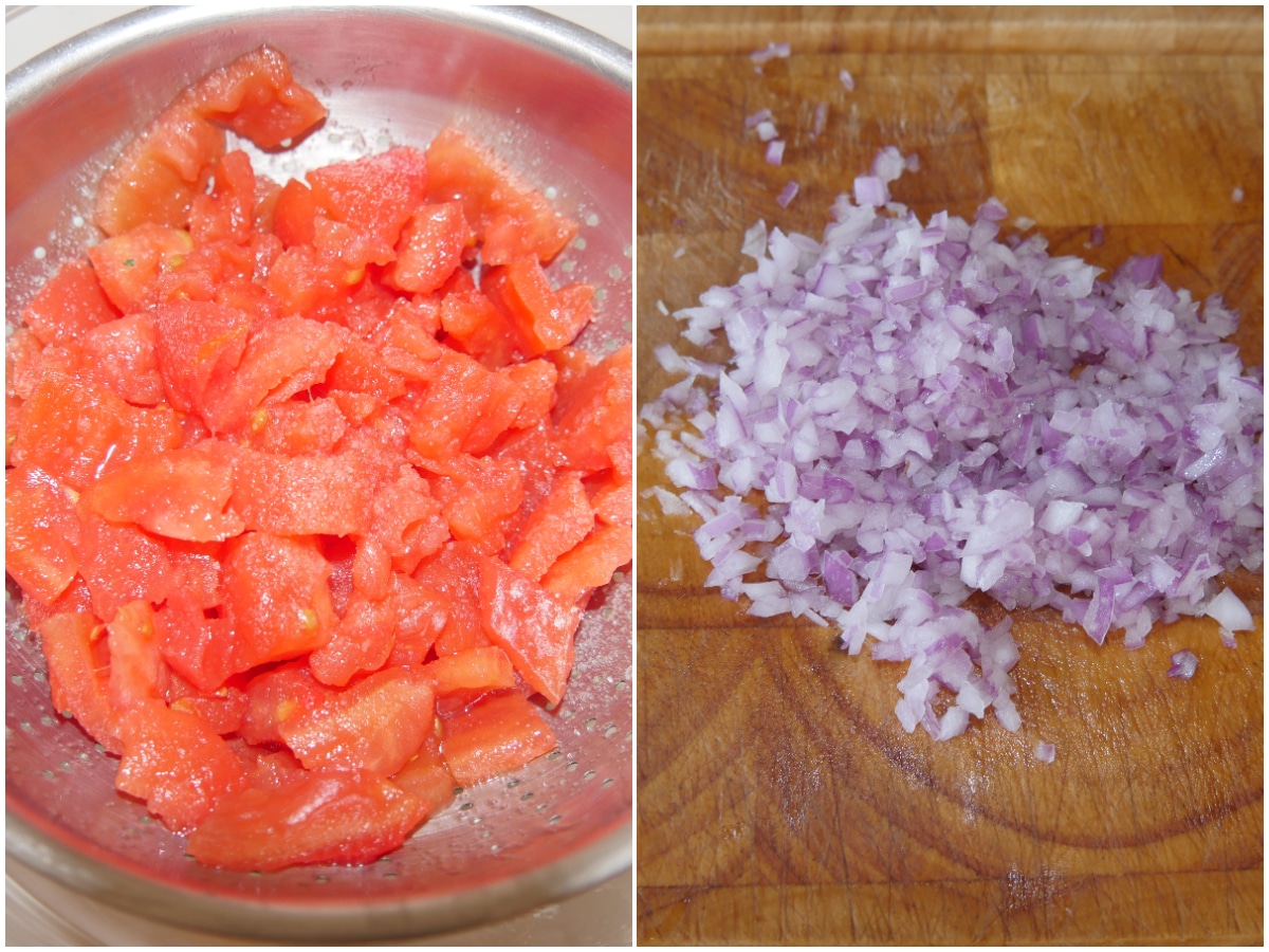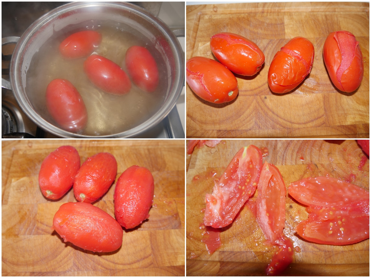 Mettete a bollire una pentola di acqua, sbollentate i pomodori (dopo averli lavati) per 30 secondi, scolateli, pelateli ed eliminate i semini.