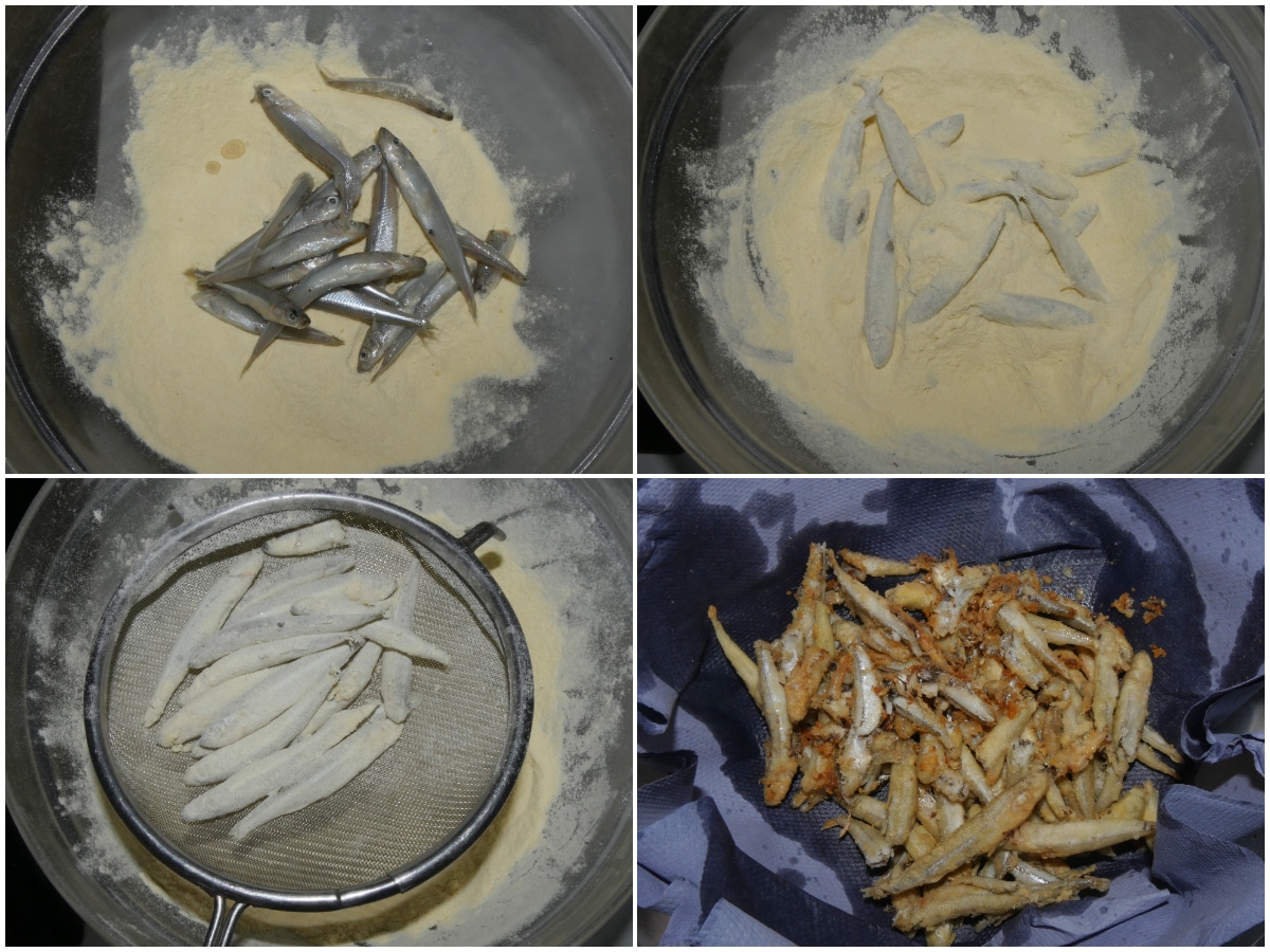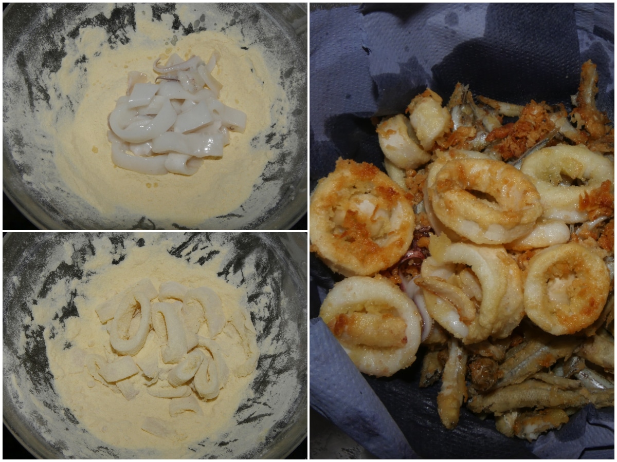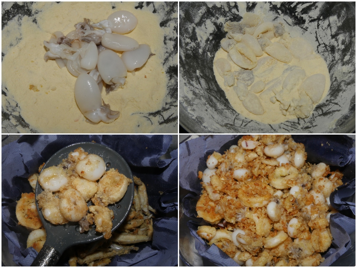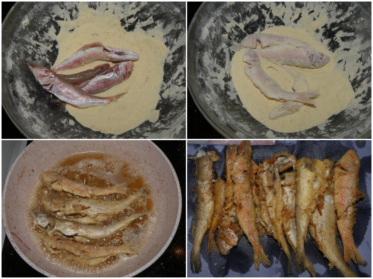 Scegliete un tipo di pesce per volta, infarinatelo, eliminate la farina in eccesso (in modo che non rimanga nell'olio a bruciarsi) e friggete in olio ben caldo, girandoli ogni tanto per farli dorare in modo uniforme: friggendo solo 1 tipo di animale per volta la cottura risulterà più agevole e uniforme.