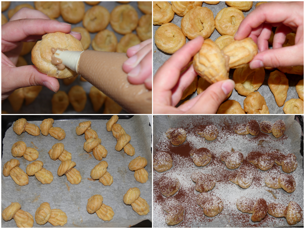 Quando sia crema che bignè saranno completamente freddi, potete assemblare i vostri funghetti: mettete la crema in una sac-à-poche con il beccuccio sottile, bucate il fondo dei cappelli con il beccuccio e riempiteli di crema, quindi inserite i gambe nel buchino lasciato dalla sac-à-poche.