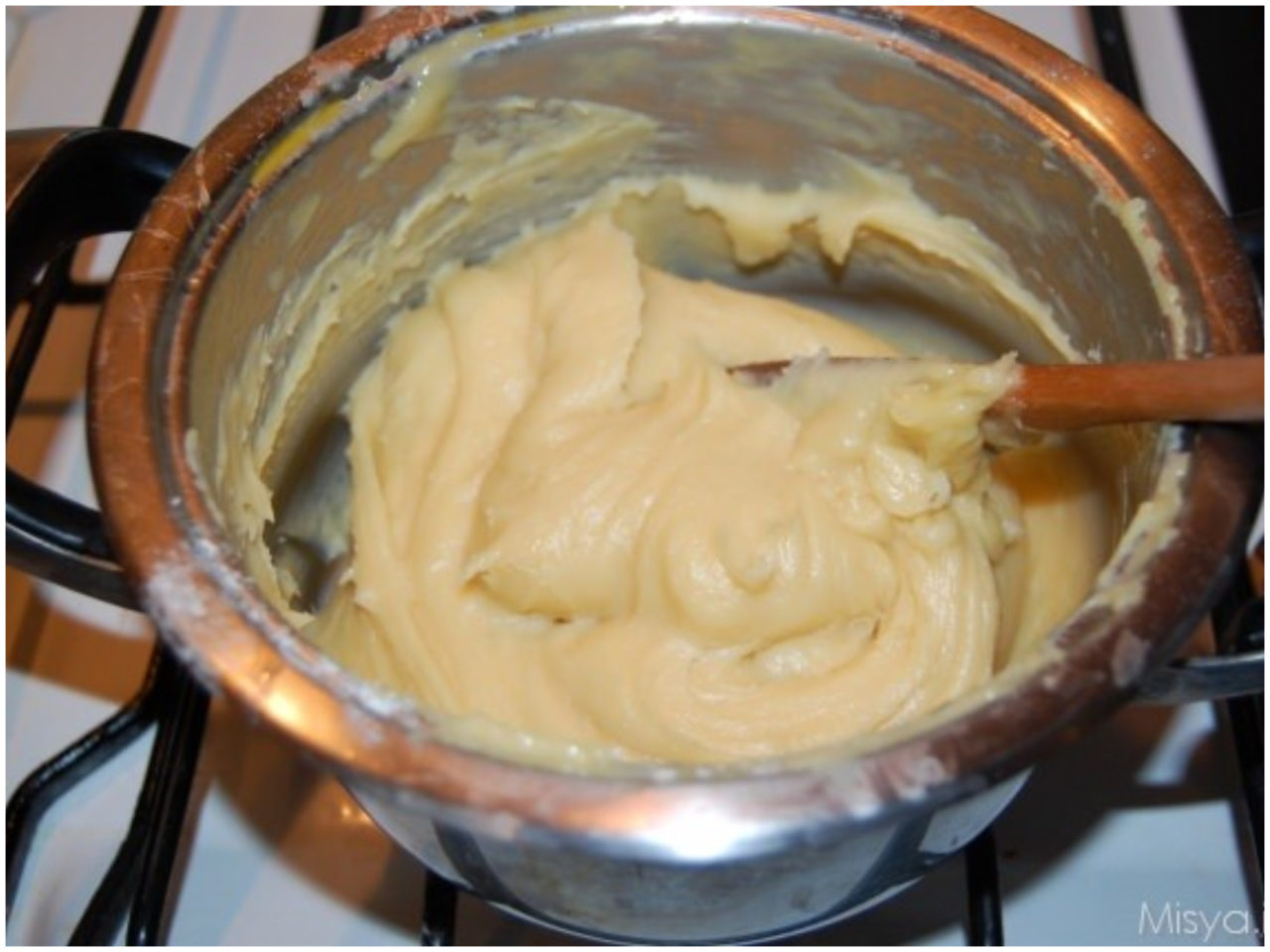 Nel frattempo potete passare a preparare la pasta choux: setacciate la farina, quindi mettete acqua, burro e sale in una pentola dal fondo spesso e portate ad ebollizione, poi togliete dal fuoco e aggiungete la farina tutta insieme, mescolando velocemente.