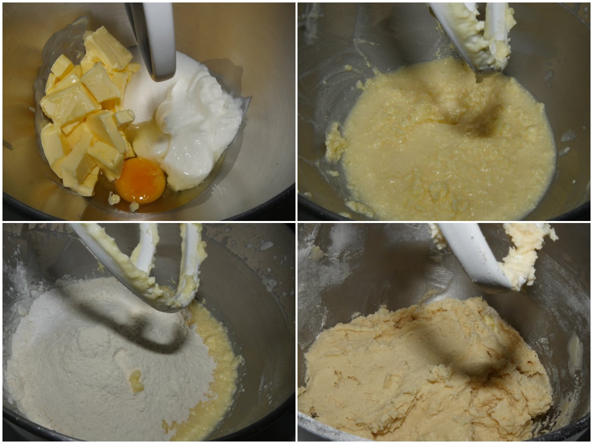 Innanzitutto preparate la pasta frolla: unite in una ciotola burro, zucchero, sale, uovo e panna acida e amalgamate, quindi incorporate anche farina e lievito setacciati.
