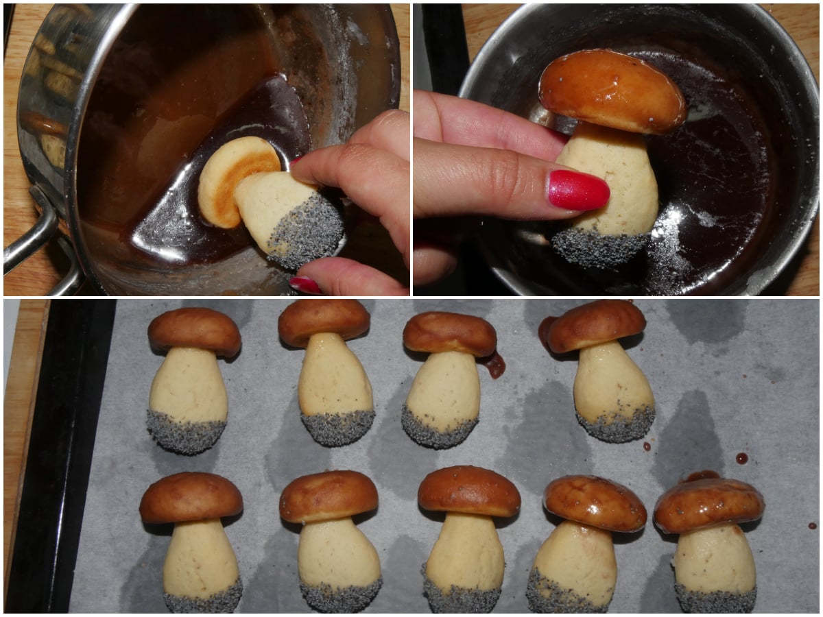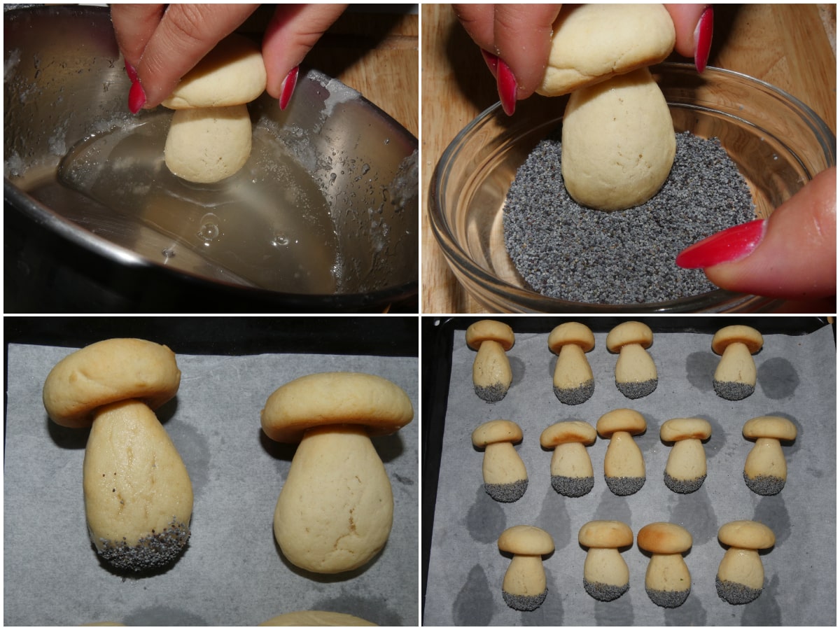 Tenendoli per la testa, immergete la base dei gambi dei funghi, uno per volta, nello sciroppo, quindi intingeteli nei semi di papavero, lasciandoli poi asciugare su carta forno.
