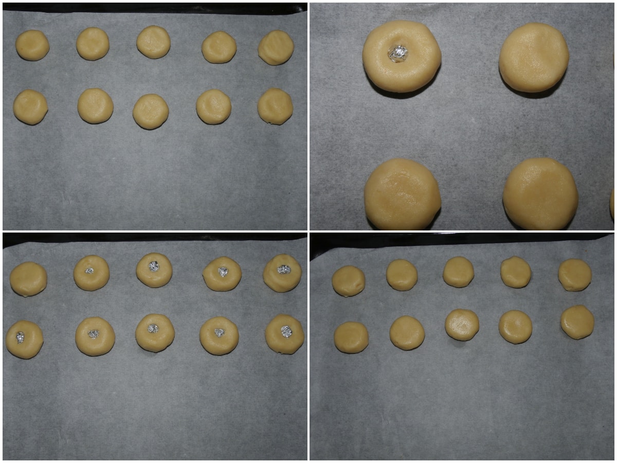 Con metà dei pezzi dovrete fare i cappelli: create delle palline, appiattitele leggermente , create un piccolo foro al centro e infilateci una pallina di carta di alluminio, quindi poggiatele con la pallina verso il basso sulla teglia rivestita di carta forno.