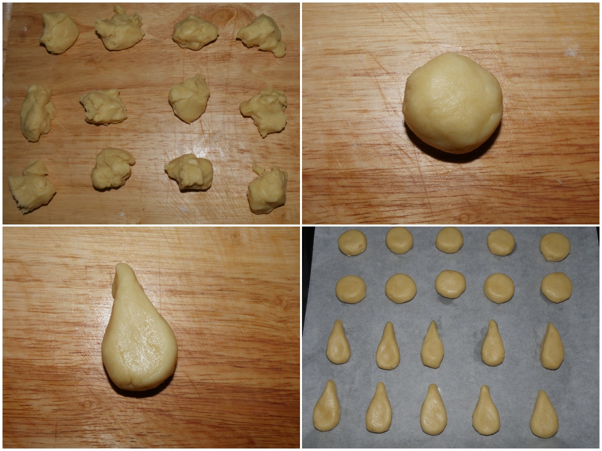 Con i pezzi restanti create sempre delle palline e poi sagomatele allungando un lato per formare una goccia (l'estremità dovrà essere abbastanza sottile da entrare nel foro lasciato dall'alluminio), poggiando anche questi sulla teglia.