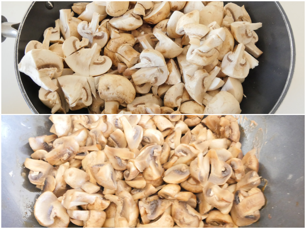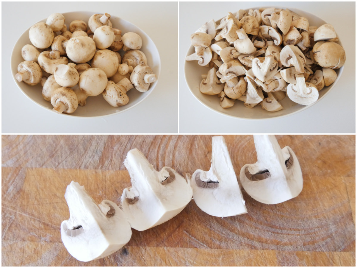 Pulite i funghi eliminando la base del gambo ed eventuali residui di terra, quindi tagliateli in 4 parti, come vedete dalla foto.