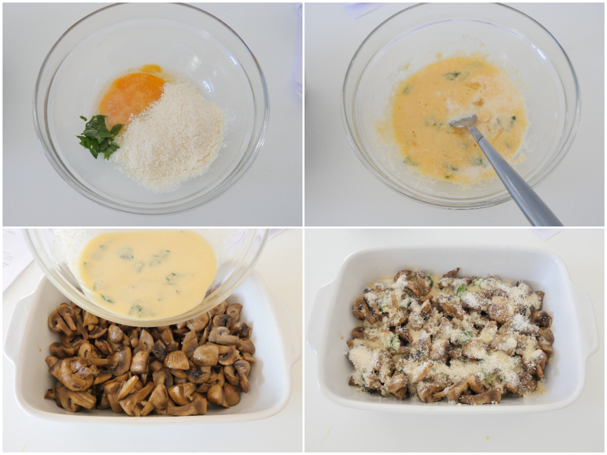 Quando i funghi saranno pronti, disponeteli in una teglia unta di olio e versateci sopra il battuto d'uovo, quindi cospargete col restante formaggio e cuocete per circa 20 minuti in forno ventilato preriscaldato a 180°C, accendendo il grill egli ultimi 5 minuti.