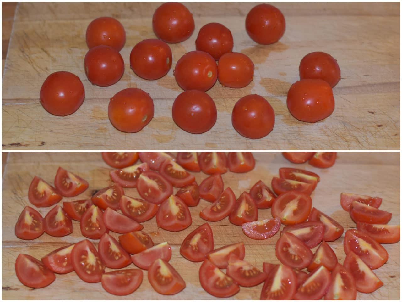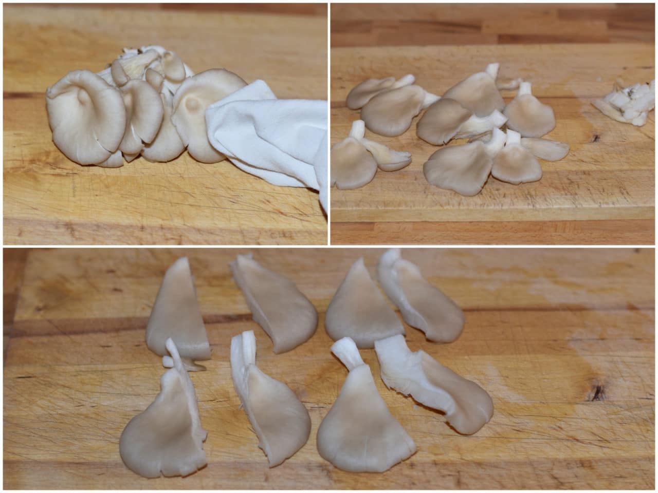 Pulite i funghi con un canovaccio pulito, quindi tagliateli a pezzi.