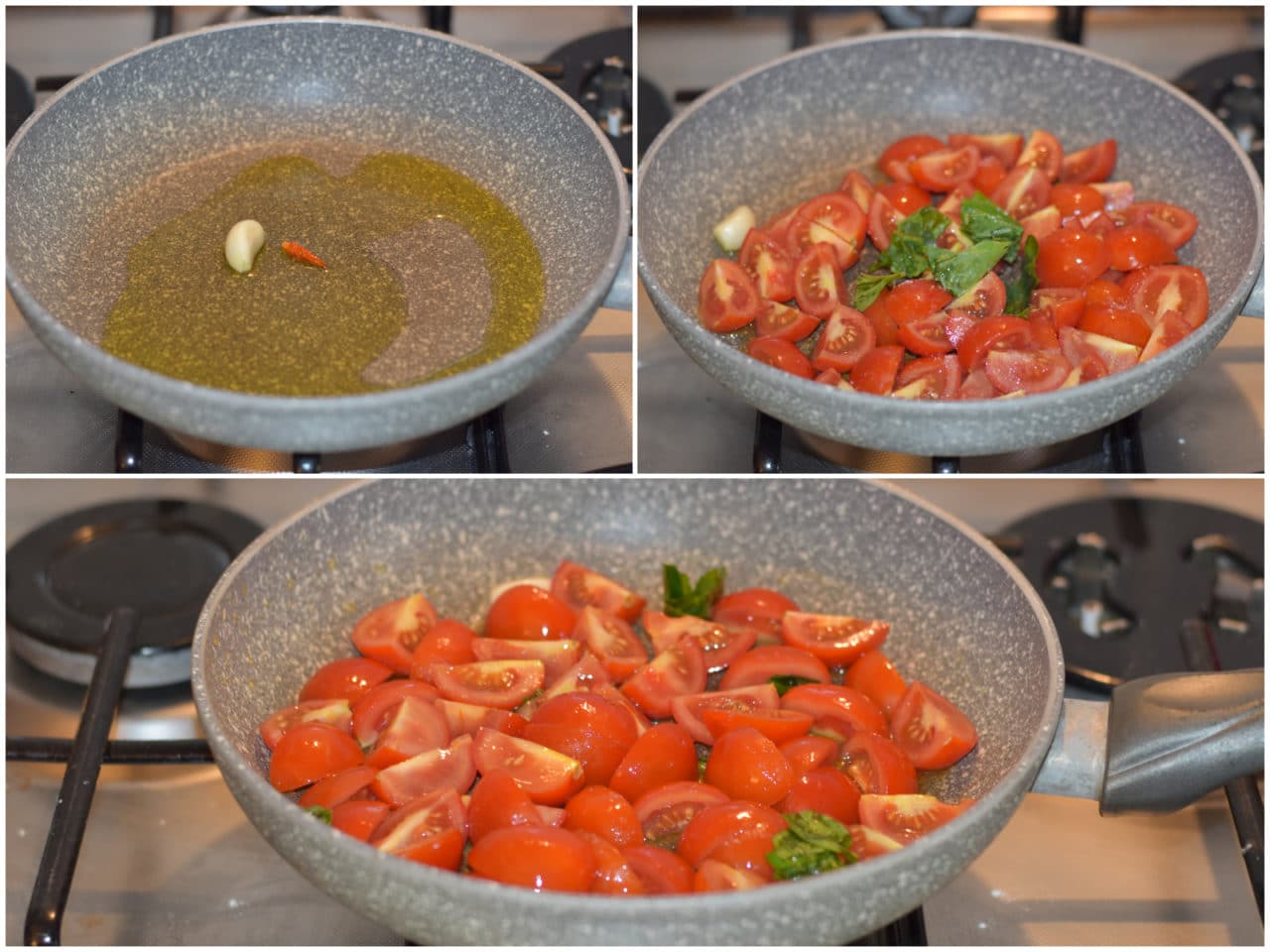 Fate scaldare in una padella ampia dell'olio con aglio e peperoncino, quindi unite pomodorini, basilico e un pizzico di sale e lasciate cuocere a fiamma medio-bassa per 10-15 minuti.