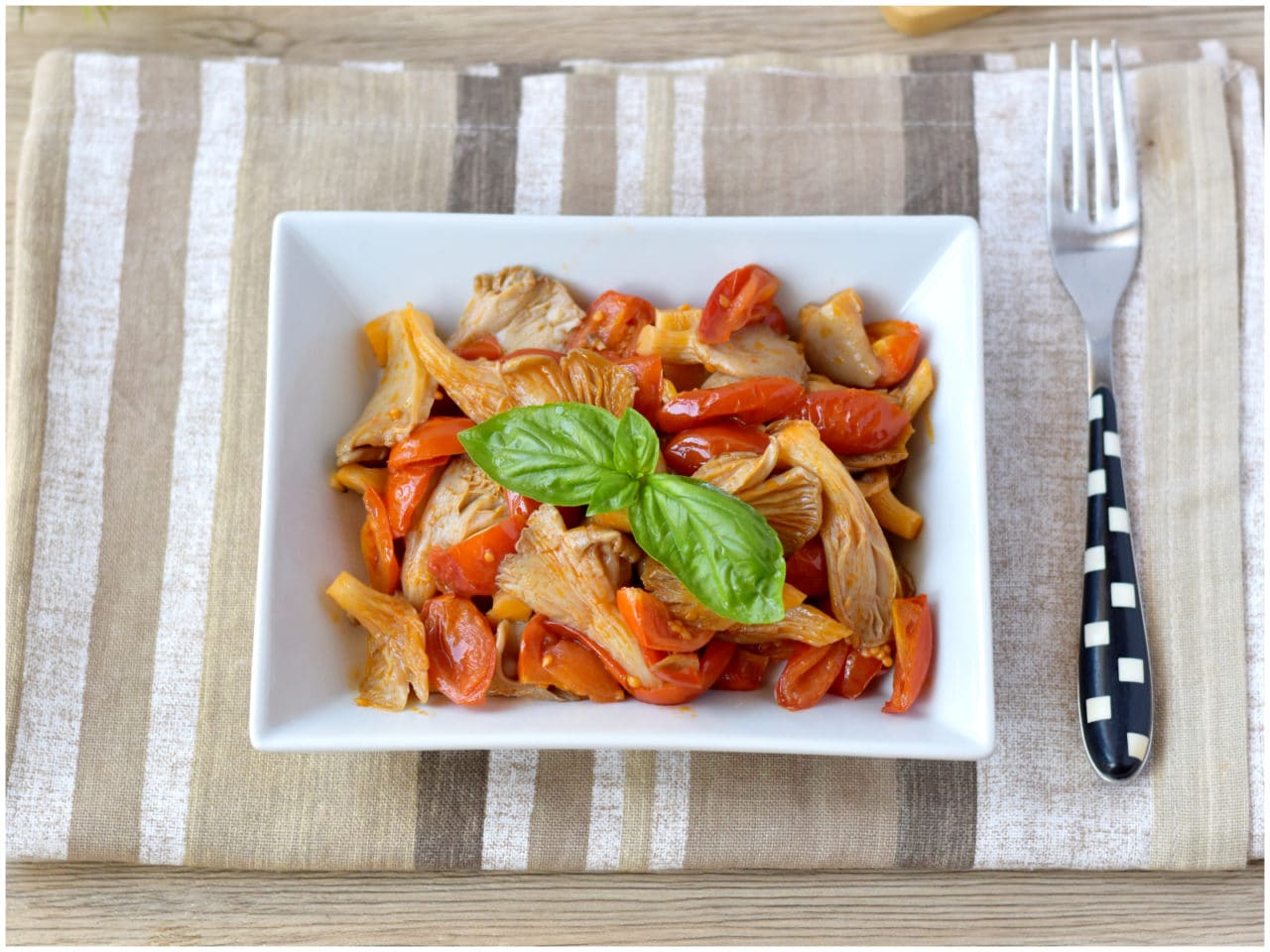 I funghi al pomodoro sono pronti, non vi resta che aggiungere un po' di basilico fresco e servirli.