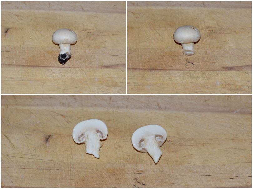 Innanzitutto mondate i funghi (qui la guida per farlo al meglio), quindi tagliateli a metà (se sono piccoli lasciateli interi).