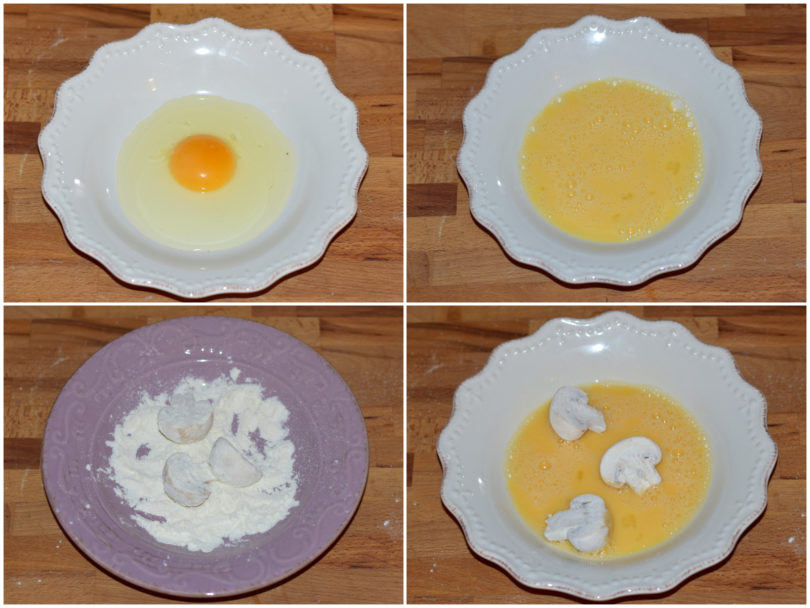 Passate i funghi prima nella farina, poi nell'uovo, infine nel pangrattato.