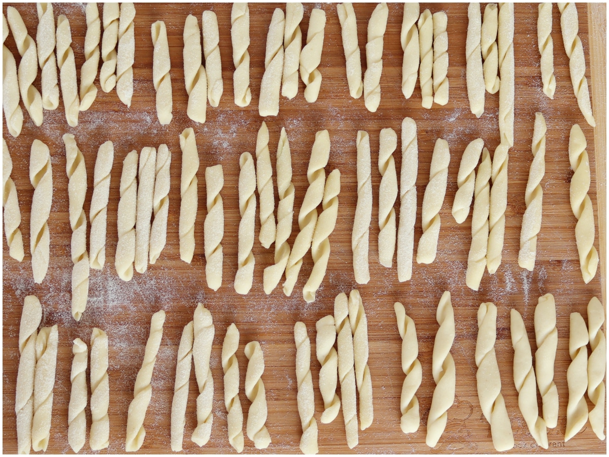 Man mano che sono pronti, poggiate i fusilli su un vassoio infarinato.