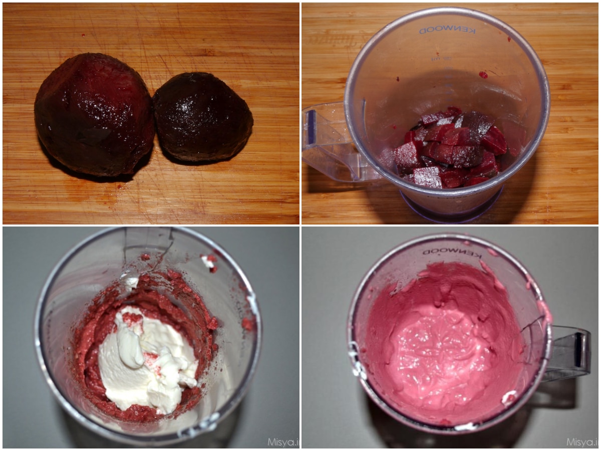 Tagliate le barbabietole a pezzi e frullatele con un mixer o un minipimer, quindi incorporate anche la ricotta: dovrete ottenere una crema liscia.