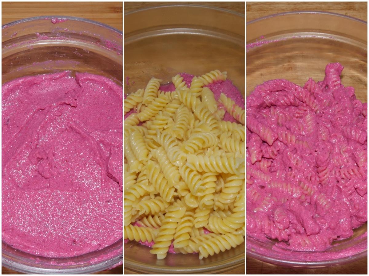 I fusilli con crema di ricotta e barbabietola sono pronti.