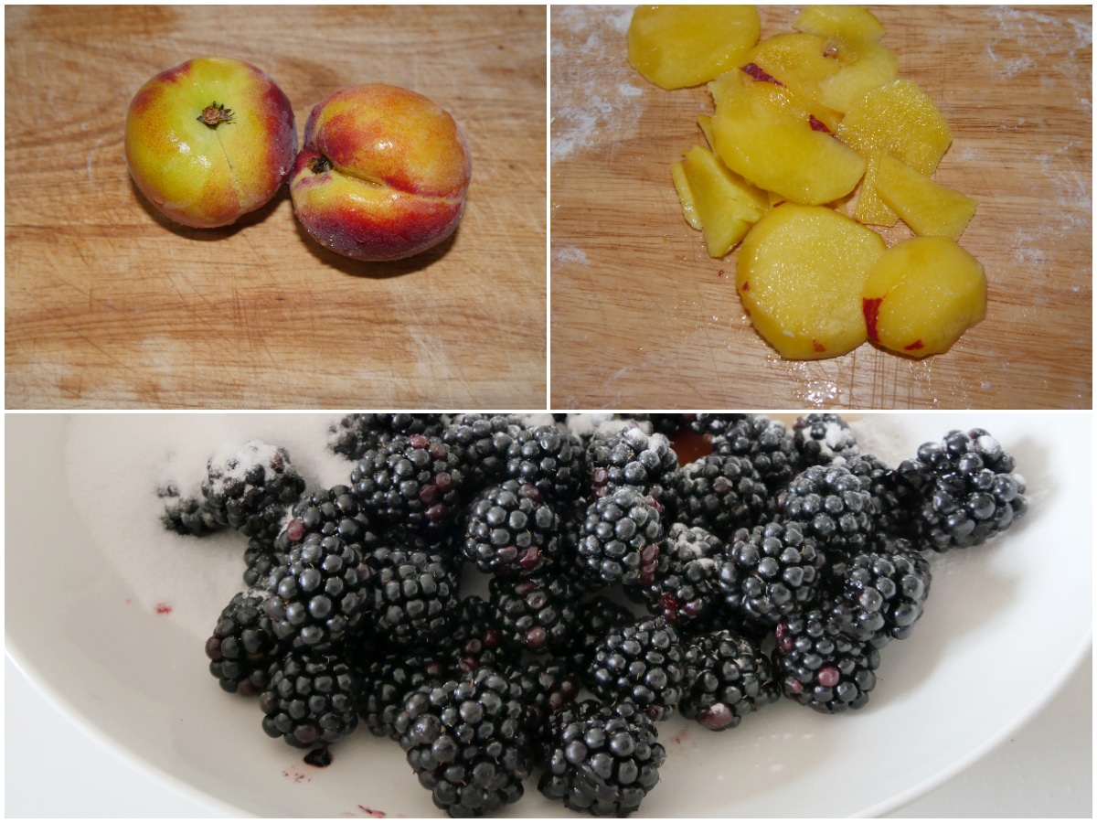 Nel frattempo preparate gli altri ingredienti: lavate, sbucciate e tagliate a fette le pesche; lavate e asciugate delicatamente le more e mescolatele con 1 cucchiaio di zucchero.
