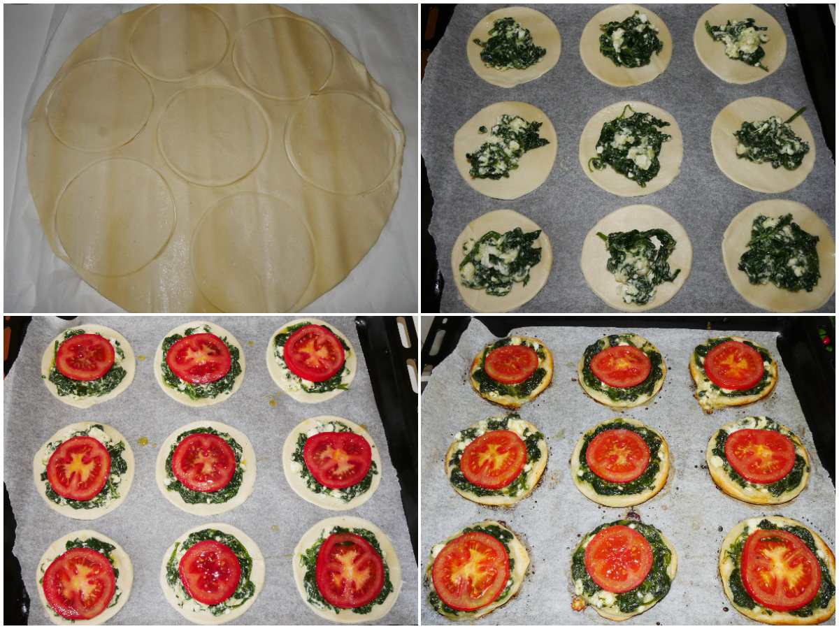 Disponeteli sulla teglia rivestita di carta forno, distribuite un po' di composto di spinaci al centro (lasciando 1 cm di bordo libero, posizionate una fetta di pomodoro al centro degli spinaci e condite con pepe a piacere.