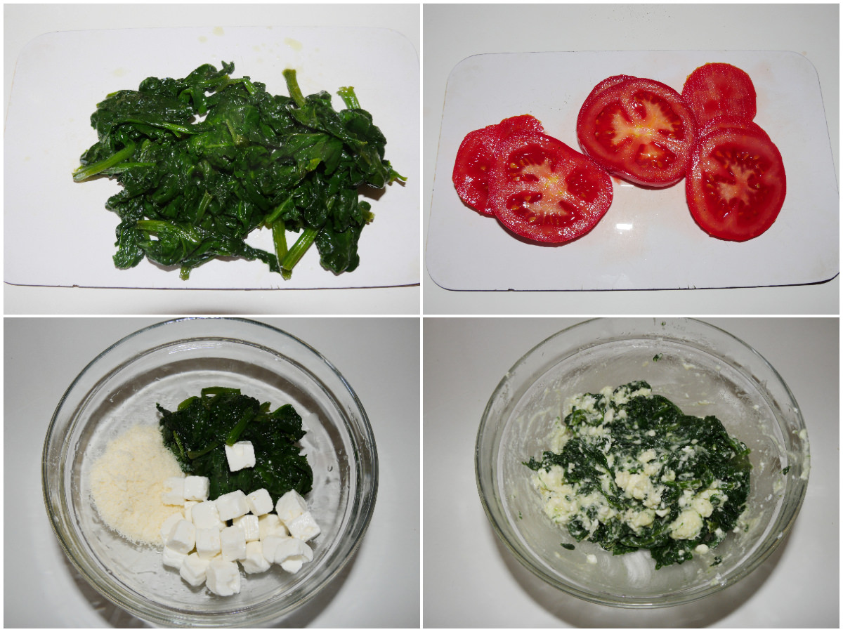 Sminuzzate gli spinaci, lavate il pomodoro e tagliatelo a fette di 1-2 cm.