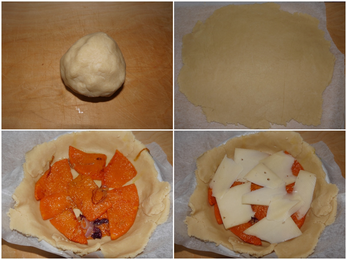Riprendete l'impasto e stendetelo in una sfoglia sottile (circa 5 mm), quindi trasferitelo nello stampo rivestito di carta forno e farcitelo a strati: prima metà della zucca, poi il formaggio affettato sottilmente e infine la zucca restante.