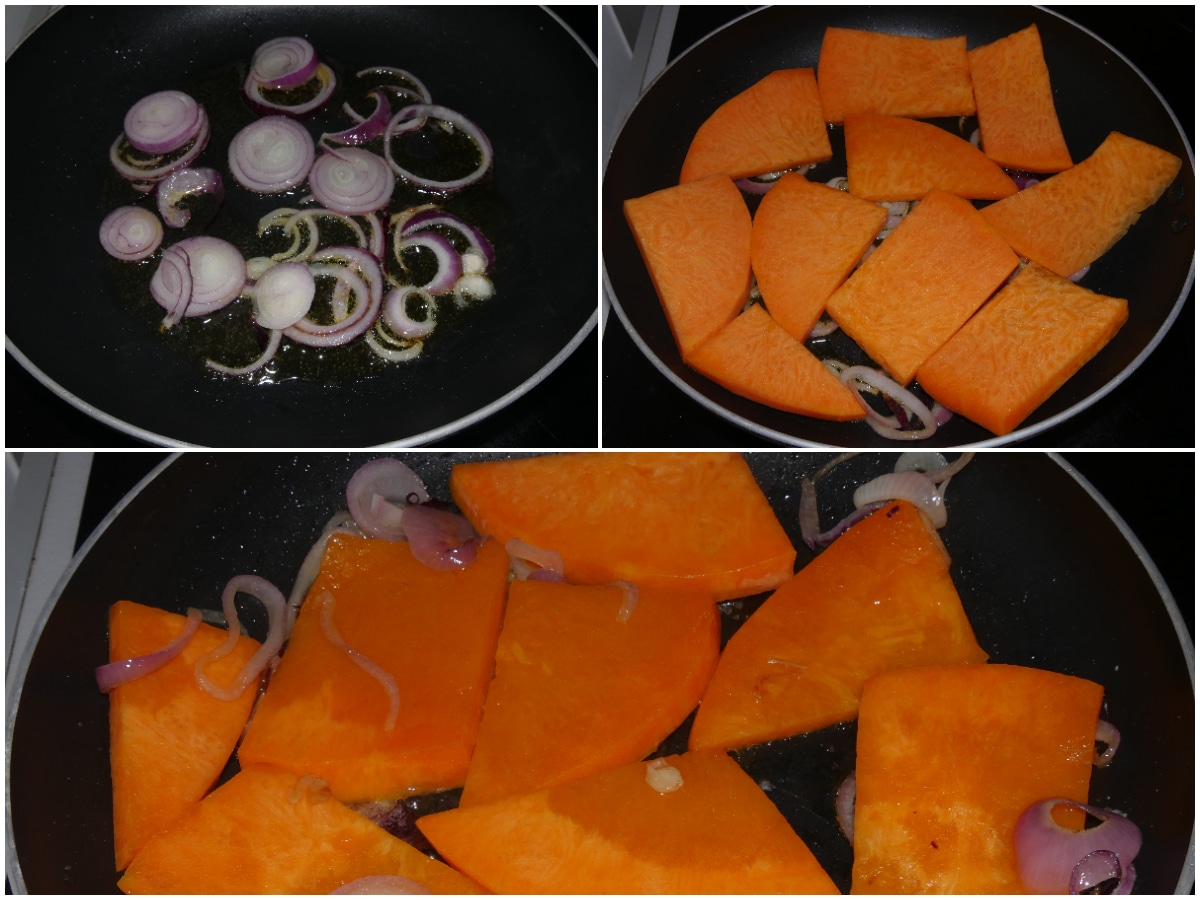 Fate appassire la cipolla in un'ampia padella antiaderente con un po' di olio, quindi unite anche la zucca e lasciatela rosolare, condite con sale e pepe, aggiungete un po' di acqua e lasciate cuocere per circa 15 minuti (dipende dallo spessore delle fette), infine lasciate intiepidire.